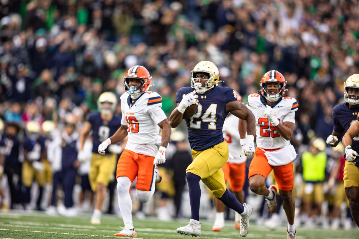 November 22, 2025, South Bend, Indiana, USA: Notre Dame Running Back JADARIAN PRICE 24 breaks away from defenders during the NCAA, College League, USA Football matchup between 9 Notre Dame Fighting Irish and the Syracuse Orange at Notre Dame Stadium in South Bend, Indiana on November 22nd, 2025. Notre Dame defeated Syracuse 70-7. South Bend USA – ZUMAs355 20251122_zsp_s355_011 Copyright: xJustinxSickingx