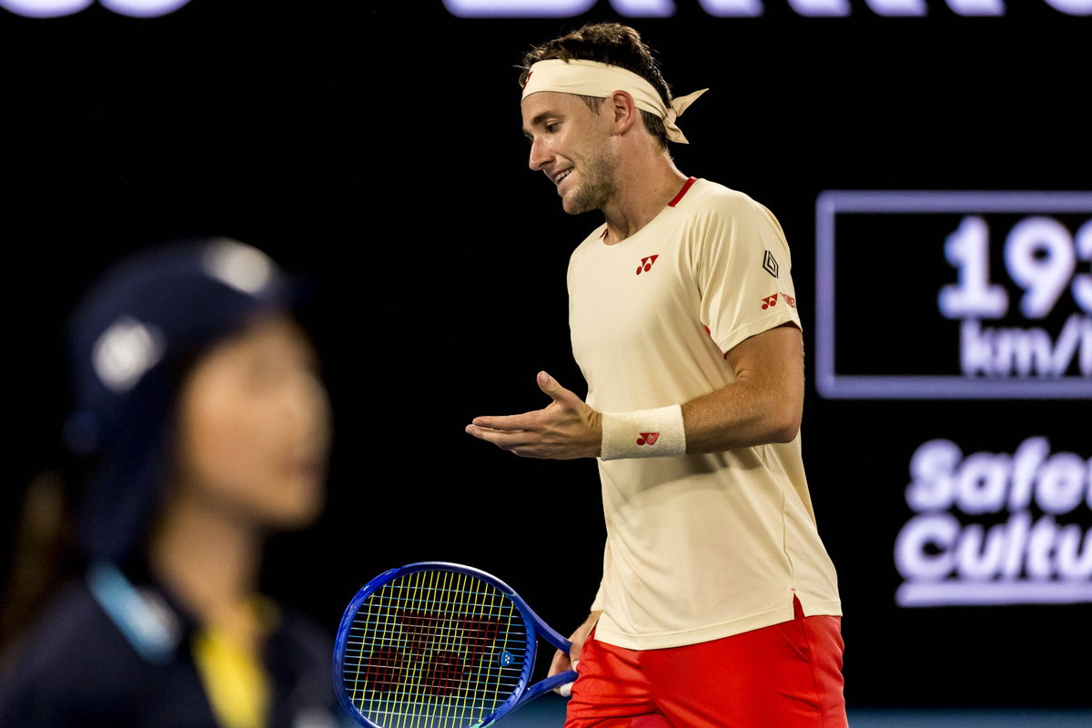 MELBOURNE, VIC – JANUARY 12: Casper Rudd of Norway shows his frustration during Round 1 of the 2025 Australian Open on January 12 2025, at Melbourne Park in Melbourne, Australia. Photo by Jason Heidrich/Icon Sportswire TENNIS: JAN 12 Australian Open EDITORIAL USE ONLY Icon250112145
