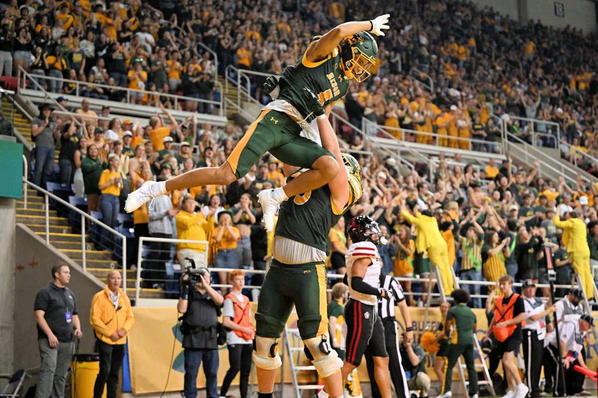 North Dakota State Bison wide receiver Bryce Lance 5 celebrates with teammates after scoring a touchdown during a NCAA, College League, USA football game between the University of South Dakota Coyotes and the North Dakota State Bison at the Fargodome in Fargo, ND on Saturday, September 27, 2025. . /CSM Fargo USA – ZUMAc04_ 20250927_zma_c04_069 Copyright: xRussellxHonsx