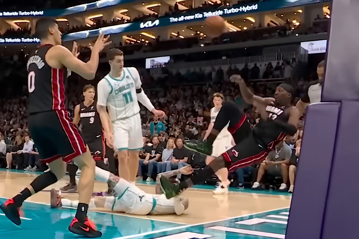 It was a frustrating night for the Miami Heat at Spectrum Center on Tuesday. They lost 126-127 against the Charlotte Hornets. And also lost their final chance at the Playoffs. But had it been all that happened on the floor, it’d be a very unnatural event in the NBA’s picture. With 11:10 minutes left in Q2, LaMelo Ball fell after missing a drive early in the second quarter. He appeared to reach out with his left arm. He grabbed Bam Adebayo’s left leg.