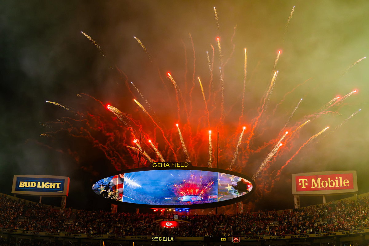 December 25, 2025 Kansas City, MO. U.S. – Fireworks above the scoreboard before the start of a week 17 National Football League football game between Denver Broncos and the Kansas City Chiefs on GEHA Field at Arrowhead Stadium in Kansas City MO..Denver won 20-13.Attendance: 73405. /Cal Media Kansas City United States of America – ZUMAc04_ 20251225_zma_c04_177 Copyright: xMichaelxSpomerx
