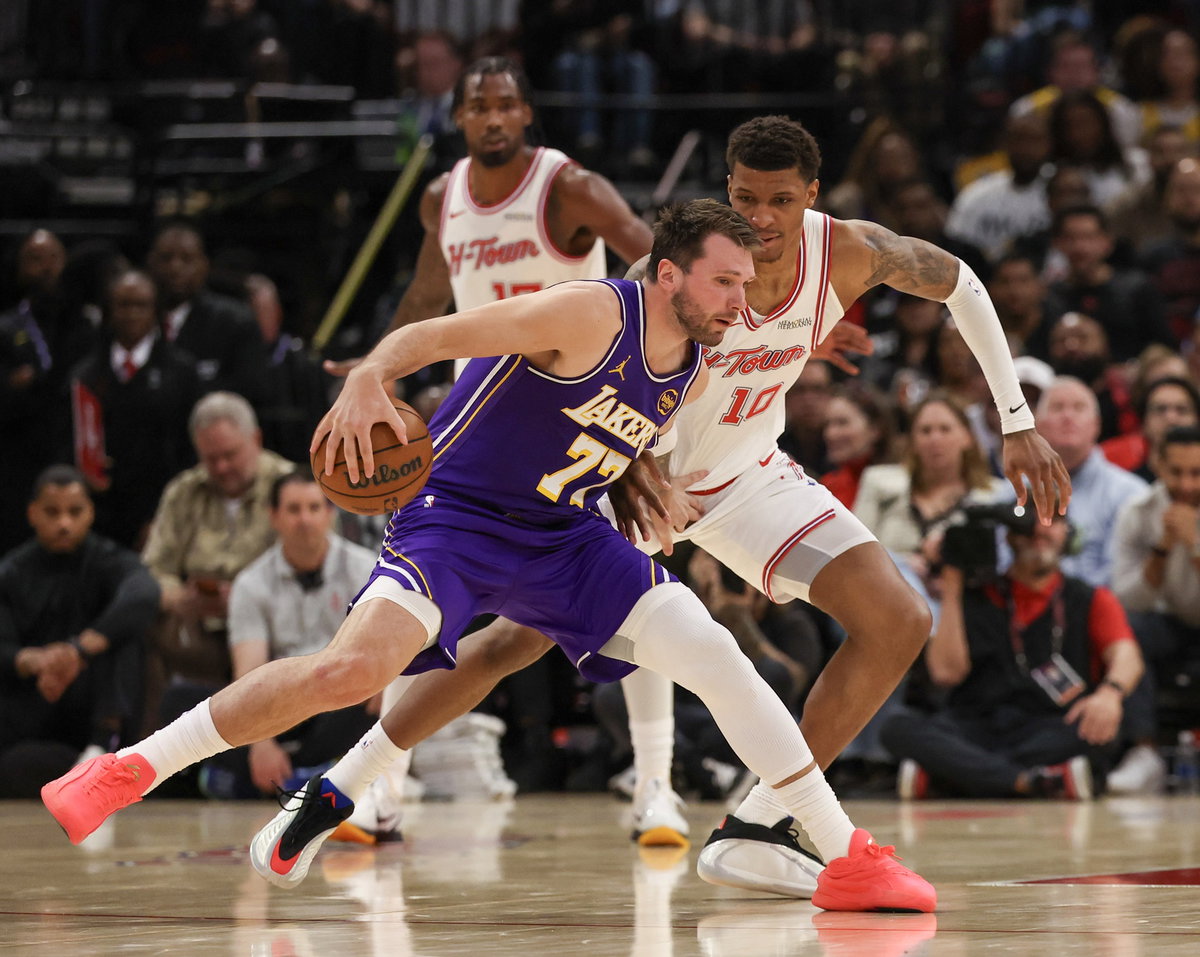 Mar 18, 2026; Houston, Texas, USA; Los Angeles Lakers guard Luka Doncic (77) dribbles against Houston Rockets forward Jabari Smith Jr. (10) in the second quarter at Toyota Center. Mandatory Credit: Thomas Shea-Imagn Images