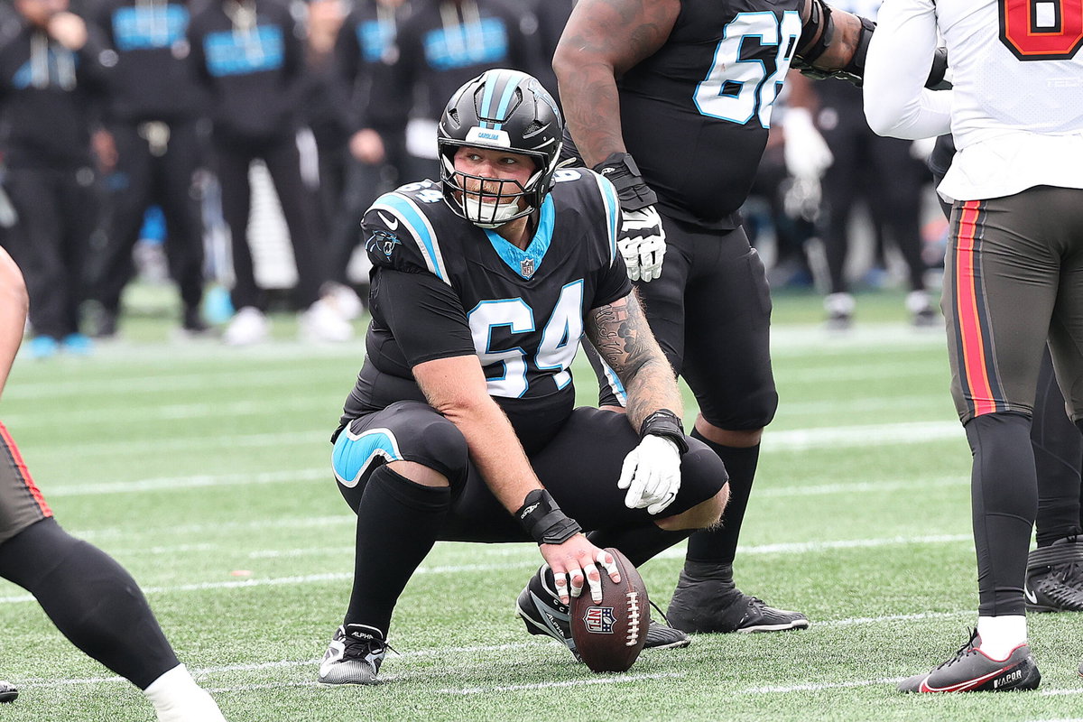 CHARLOTTE, NC – DECEMBER 21: Carolina Panthers center Cade Mays 64 during an NFL, American Football Herren, USA football game between the Tampa Bay Buccaneers and the Carolina Panthers on December 21, 2025 at Bank of America Stadium in Charlotte N.C. Photo by John Byrum/Icon Sportswire NFL: DEC 21 Buccaneers at Panthers EDITORIAL USE ONLY Icon251221153