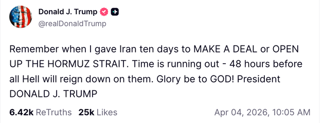 President Donald Trump posted a menacing reminder of his April 6 deadline he set for Iran to open the Strait of Hormuz.