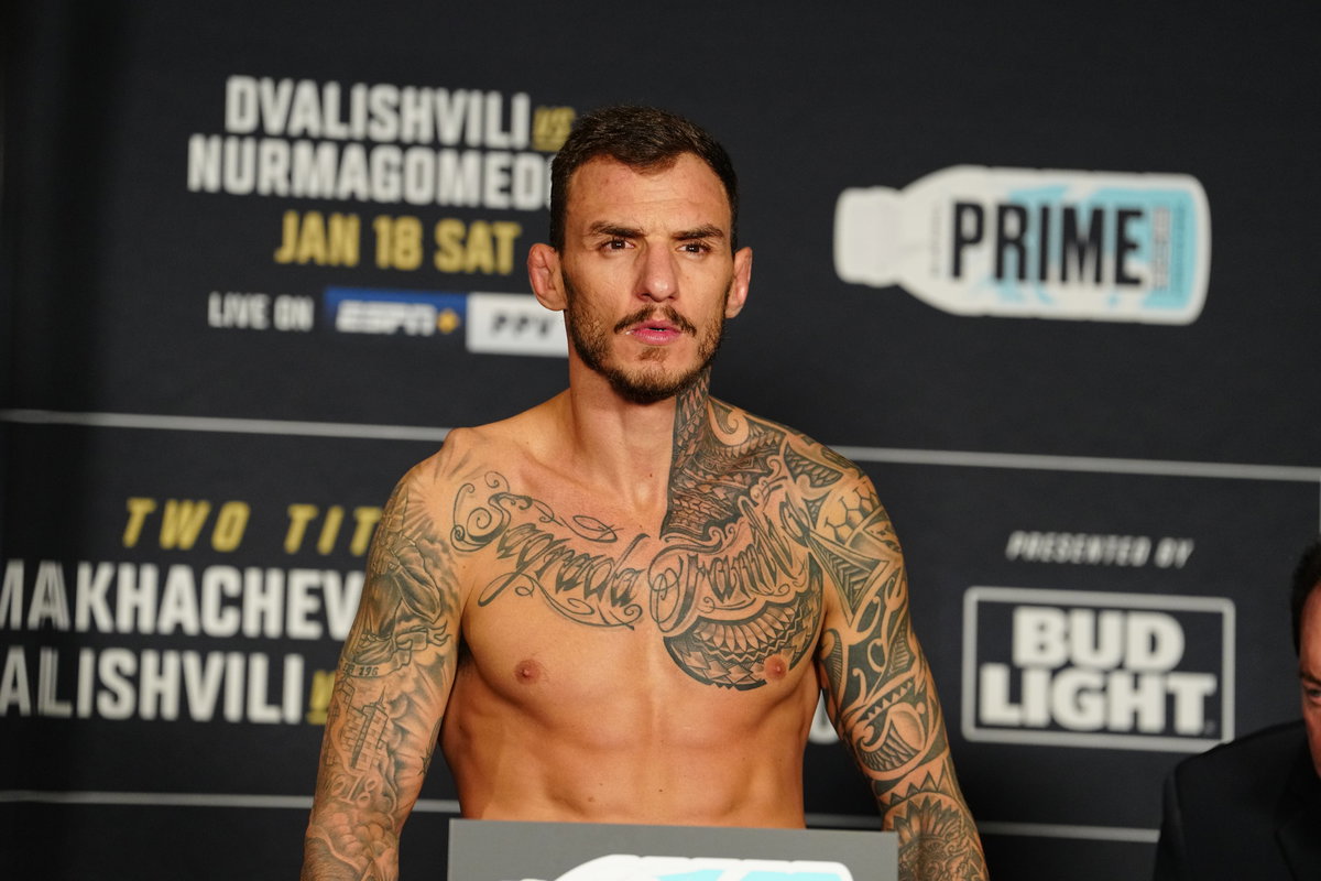 Intercontinental Downtown Los Angeles LOS ANGELES, CA- JANUARY 17: Renato Moicano steps on the scale for the official weigh-in at Intercontinental Downtown Los Angeles for UFC311 Makhachev vs Tsarukyan 2 : Official Weigh-ins on January 17, 2025 in Los Angeles, CA, United States. Photo by Louis Grasse/PxImages Louis Grasse / SPP PUBLICATIONxNOTxINxBRAxMEX Copyright: xLouisxGrassex/xSPPx spp-en-LoGr-lrg2501170077295_UFC311