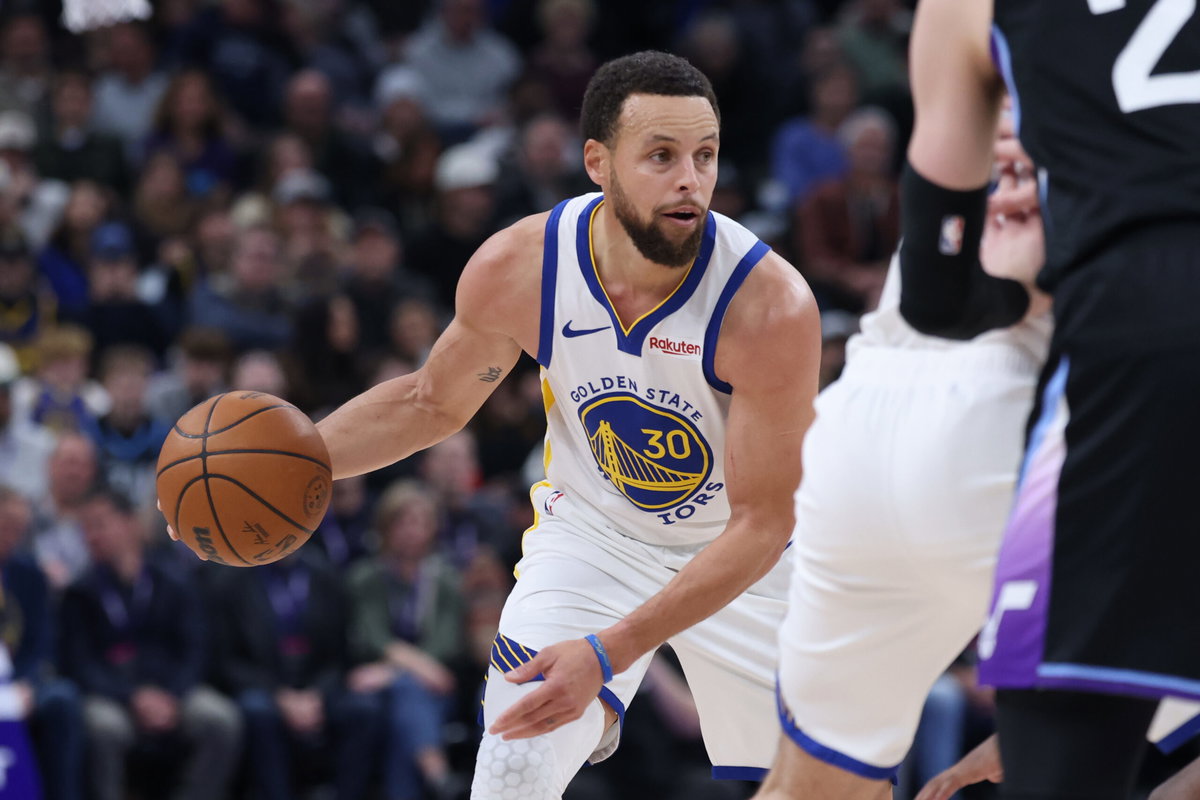 Jan 28, 2026; Salt Lake City, Utah, USA; Golden State Warriors guard Stephen Curry (30) looks for the play against the Utah Jazz during the second half at Delta Center. Mandatory Credit: Rob Gray-Imagn Images